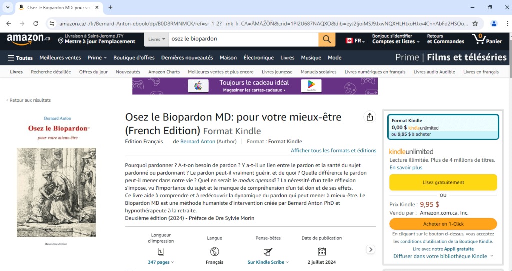 Cette deuxième édition, fraîchement sortie sur Kindle il y a deux jours, est facilement accessible aux lecteurs du monde entier. Sa disponibilité numérique permet à un public large de découvrir et de bénéficier de la méthode Biopardon MD, favorisant ainsi une diffusion plus large de cette approche innovante du pardon.
